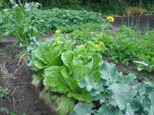 白菜(手前)とトウモロコシ(奥)。白菜は見事に花が咲いちゃってますね。白菜はおいしくいただきました。