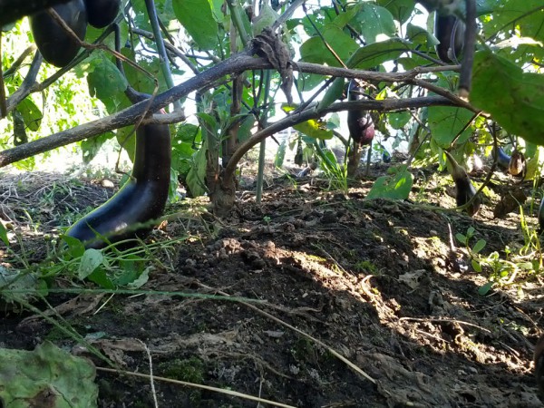丁度ナスの葉と里芋の葉が屋根の役割をして、日光を適度に遮ってくれます。真夏の暑い時期には、多くの虫たちがこのような葉っぱで蔽われた緑のモールの下で休んでいるんでしょう。でも虫たちにとっては都合が良いかもしれませんが、草取りをする私からすれば、畝の間に入って行きづらいので大変です。