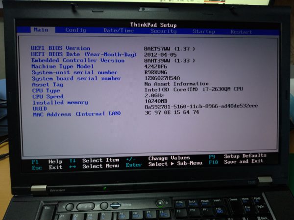 念のため、新たに換装したCPUがBIOSで認識されているかを確認してみます。ちゃんと『Intel (R) Core(TM) i7-2630QM CPU』と認識されていますね。一安心です。