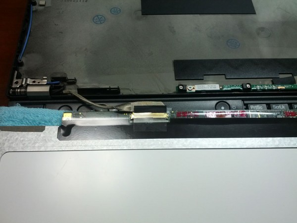 ここで、次の作業に入る前に、柔らかな布巾をキーボードの上に置いてください。そして、その上に液晶パネルを優しく置きます。裏側にあるLCDケーブルが傷つかないようにしてください。